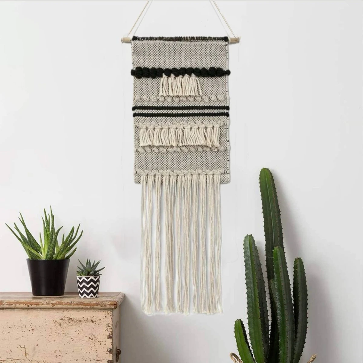 طرح مکرومه با دقت و ظرافت بافته شده و حس هنری و سنتی را به همراه جلوهای مدرن منتقل می کند. طول کل دیوارکوب تقریباً 95 سانتی متر و عرض آن حدود 31 سانتی متر است، بخش مکرومه بافی آن حدود 26×76 سانتی متر می باشد.