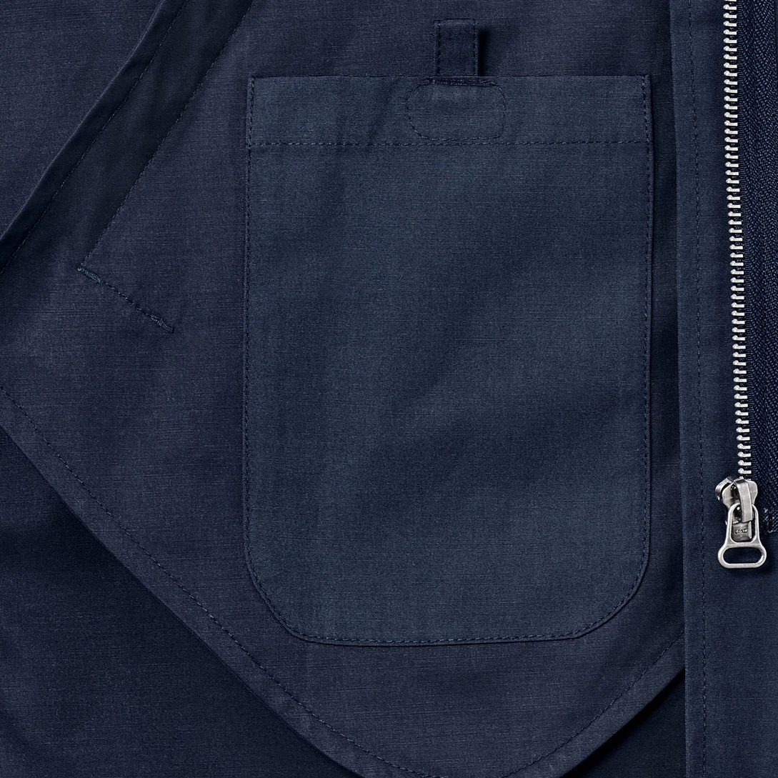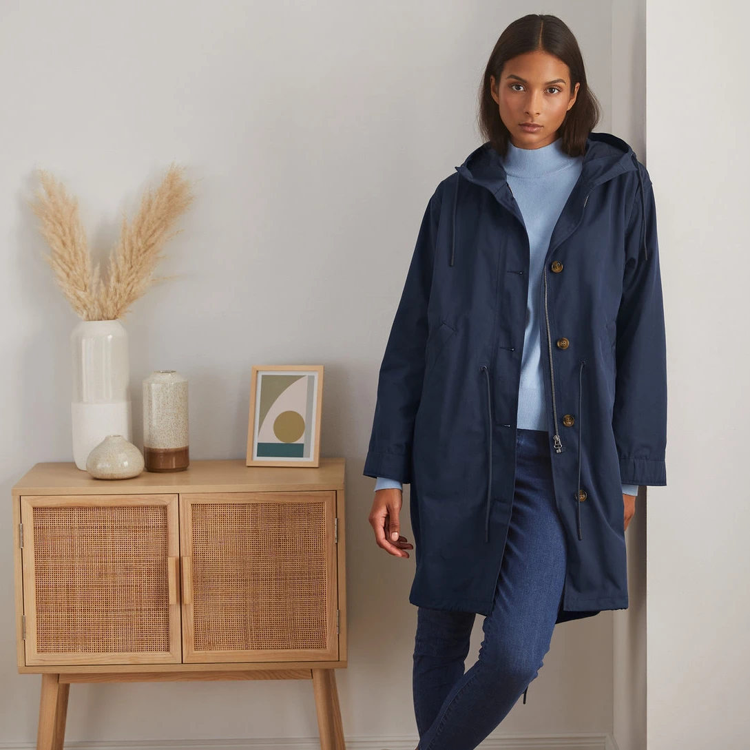 در قسمت جلوی بارانی کلاه دار، جیب در دو طرف و جیب داخلی تعبیه شده تا فضای کافی برای نگهداری وسایل شخصی فراهم شود. این مدل یک بارانی با سرشانه های کمی افتاده است همچنین انتهای آستین ها با دو دکمه تنظیم سایز طراحی شده تا تناسب بهتری ایجاد کند.