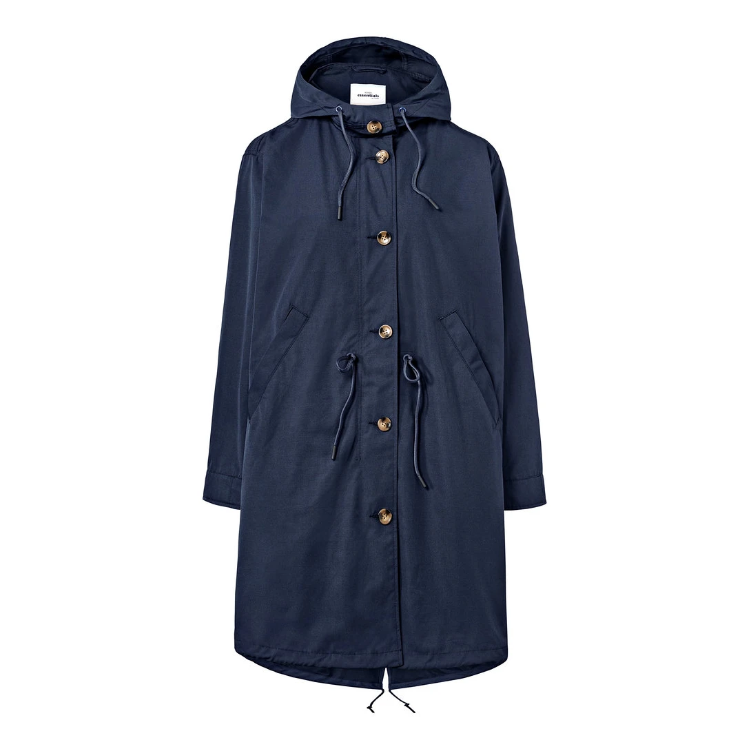 جنس بارانی سرمه ای دکمه دار زنانه چیبو از پلی استر با ترکیب الاستین بوده که انتخابی مناسب برای استفاده در روز های سرد و بارانی محسوب می شود. جلو با زیپ و با دکمه طراحی شده که به محافظت بهتر در برابر سرما و باد کمک کرده همچنین وجود کلاه با بند تنظیم سایز، راحتی بهتر را فراهم می سازد.