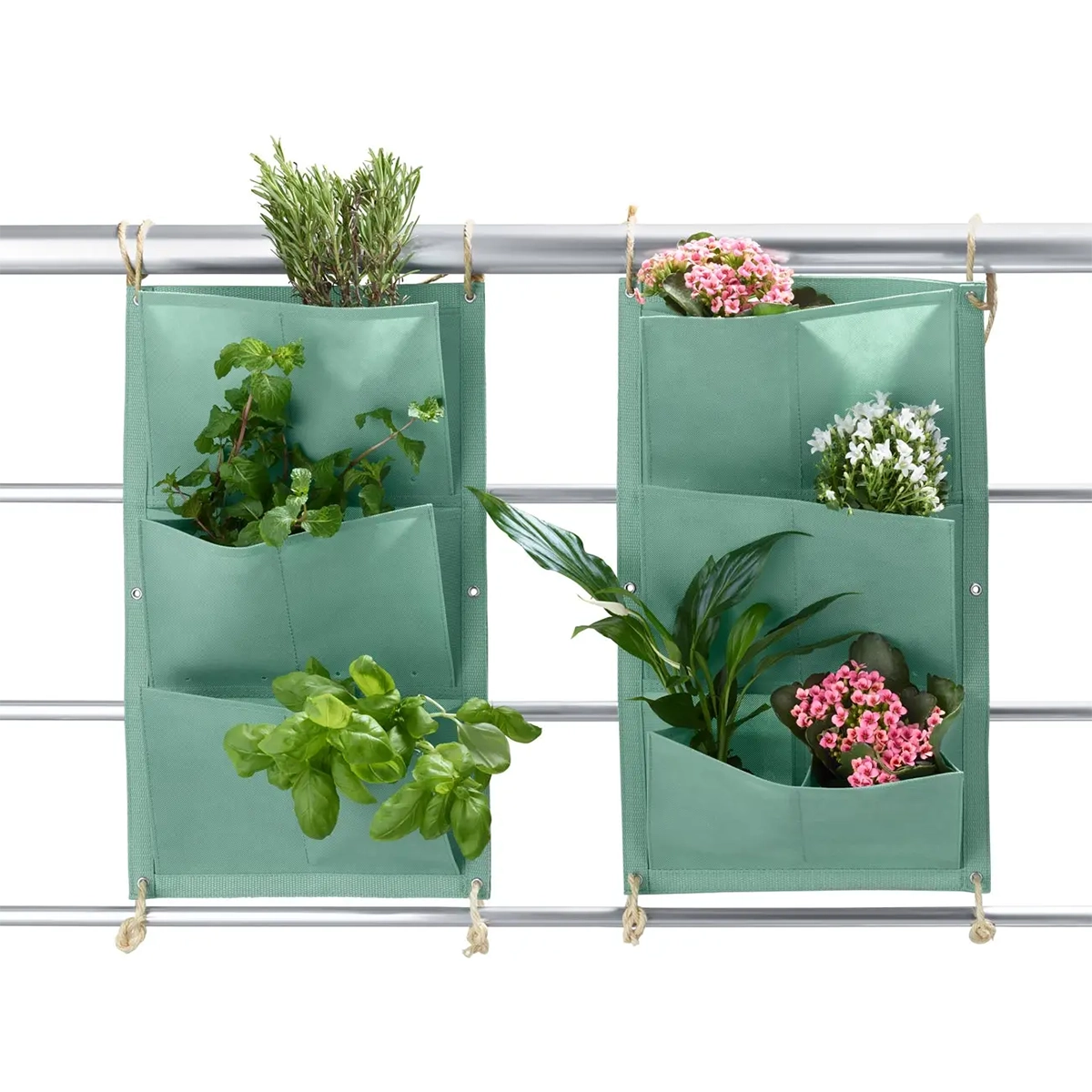جنس کیسه کاشت گیاه آویزی Tchibo پلی پروپیلن مقاوم بوده و مجهز به 6 جیب مجزا برای کاشت انواع گل، سبزی و گیاهان است. دارای حلقه های فلزی ضد زنگ برای نصب آسان و ایمن، جیب های بالایی دارای سوراخ زهکشی برای جلوگیری از تجمع آب و جیب پایینی کاملاً عایق بندی شده برای محافظت از دیوار و جلوگیری از نشت آب و خاک می باشد.