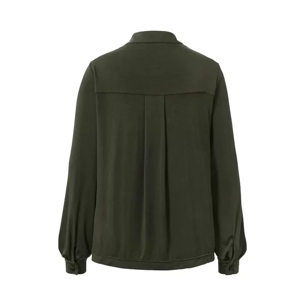 بلوز سبز یشمی زنانه چیبو از جنس ویسکوز نرم و لطیف بوده و با خاصیت کشسانی، آزادی حرکت بیشتری را برای فرد فراهم می کند. یقه هفت آن ظاهری زنانه و مدرن به آن داده و باعث جلب توجه به قسمت گردن و شانه ها می شود.