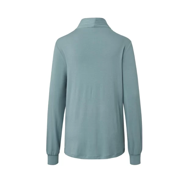 آستین آن بلند بوده و دارای مچ کشباف می باشد. یقه هفت بوده و دارای یقه کوچک ایستاده نیز می باشد. دوخت جلوی لباس آن را از دیگر لباس ها متمایز می کند. کشسانی آن باعث شده تا فرم خود را پس از بارها شستشو و استفاده مکرر حفظ کند. فروشگاه چیبوکالا از بلوز آستین بلند زنانه Tchibo در سایز S , L موجود دارد.