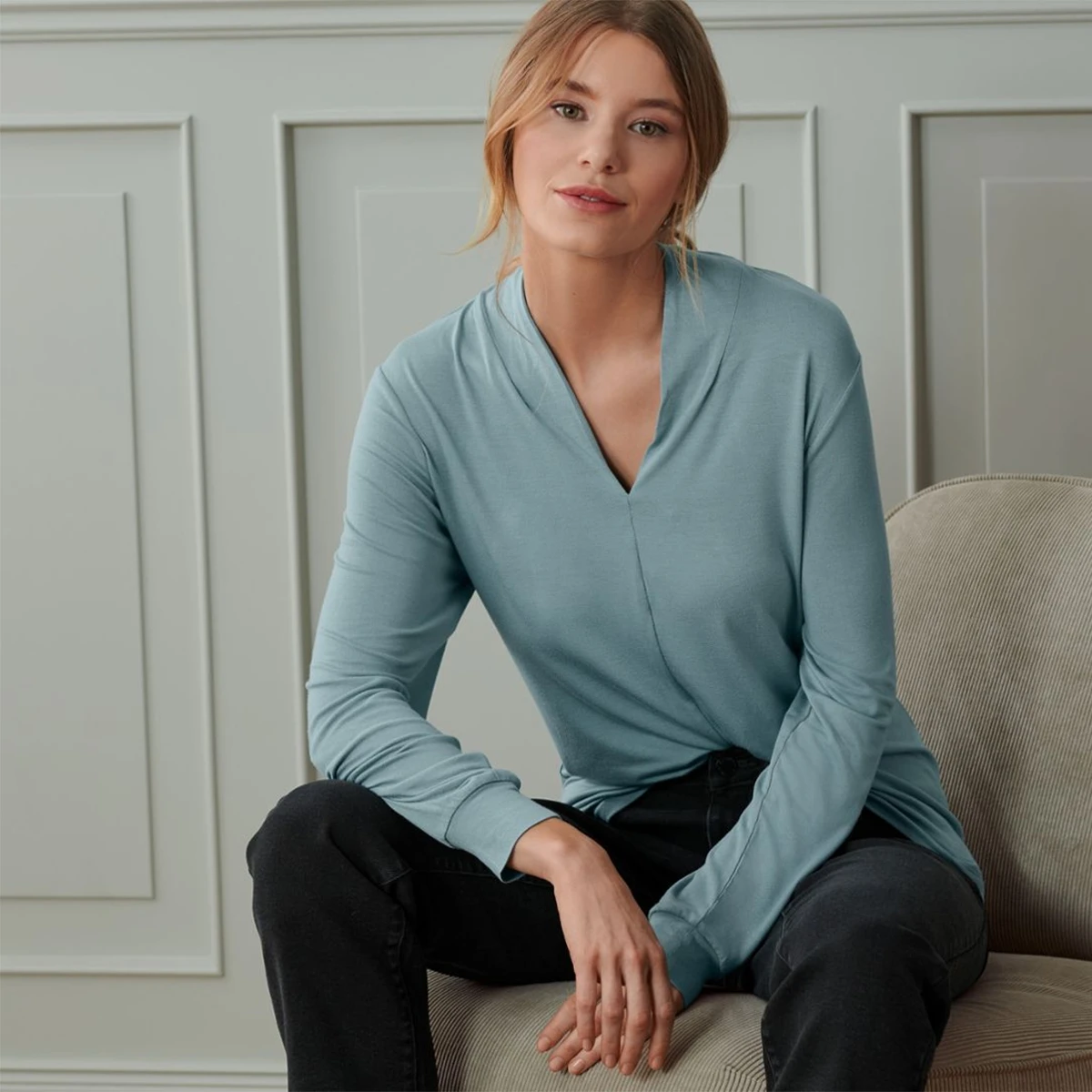 خانه » فروشگاه » زنانه » پیراهن، بلوز و شومیز » بلوز یقه هفت زنانه آبی دودی چیبو