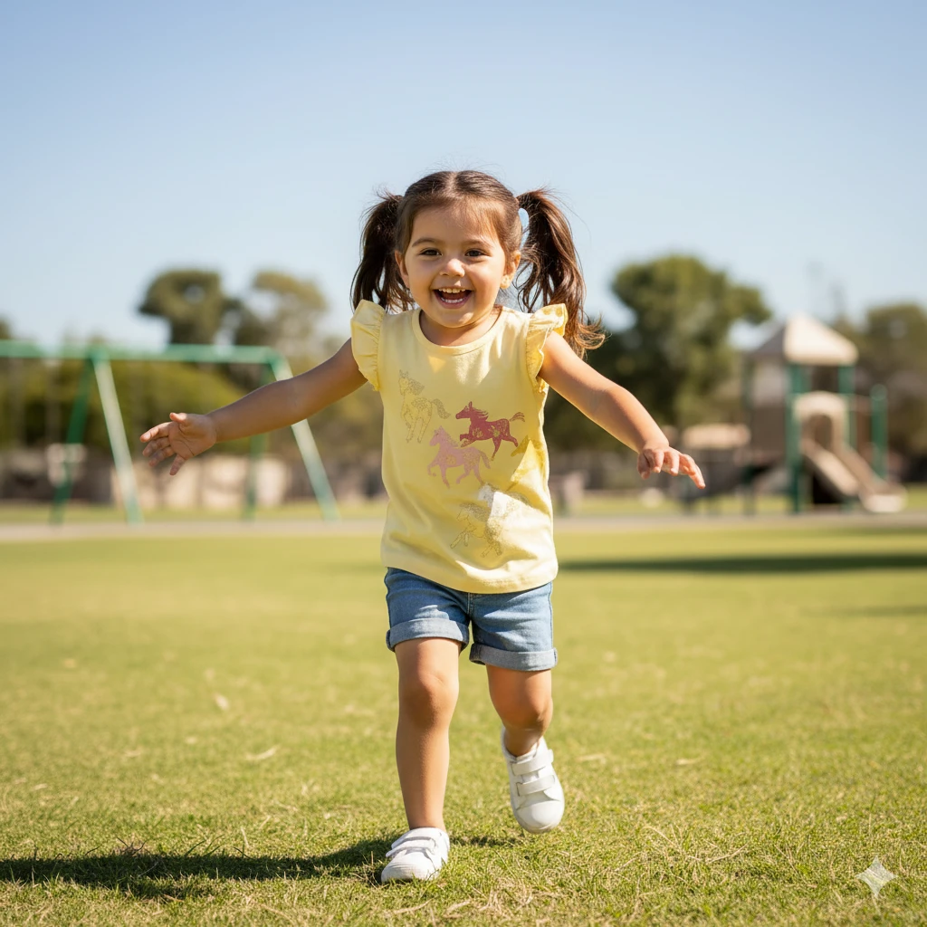 رنگ زرد به تی شرت ظاهری شاد و کودکانه داده که مناسب استفاده روزانه است. طرح اسب های رنگارنگ مورد علاقه دختران کوچک می باشد. آستین آن پروانه ای بوده که به دلیل ظاهر زیبایی که دارد با شلوار و دامن ست شده و در مهمانی های دوستانه پوشیده می شود.