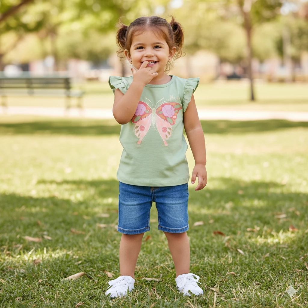 رنگ سبز به تی شرت ظاهری شاد و کودکانه داده که مناسب استفاده روزانه و هنگام استراحت است. طرح پروانه رنگارنگ مورد علاقه دختران کوچک می باشد. همچنین آستین پروانه ای به زیبایی آن افزوده و به راحتی با انواع شلوار و دامن بچگانه ست می شود و در مهمانی های دوستانه ترکیب زیبایی را به وجود می آورد.