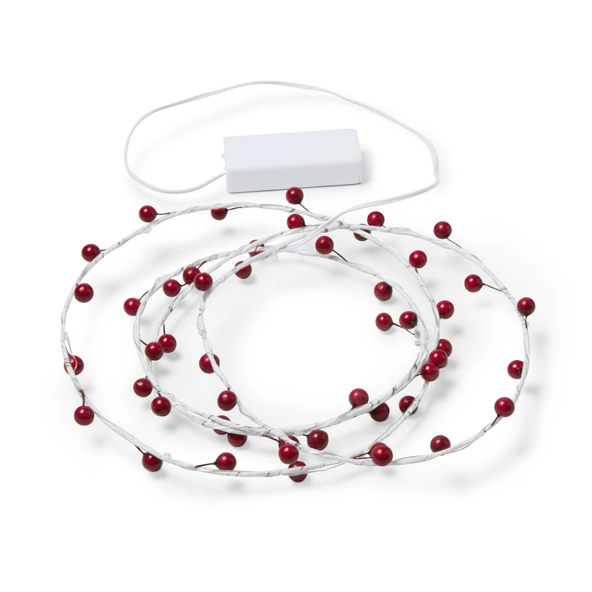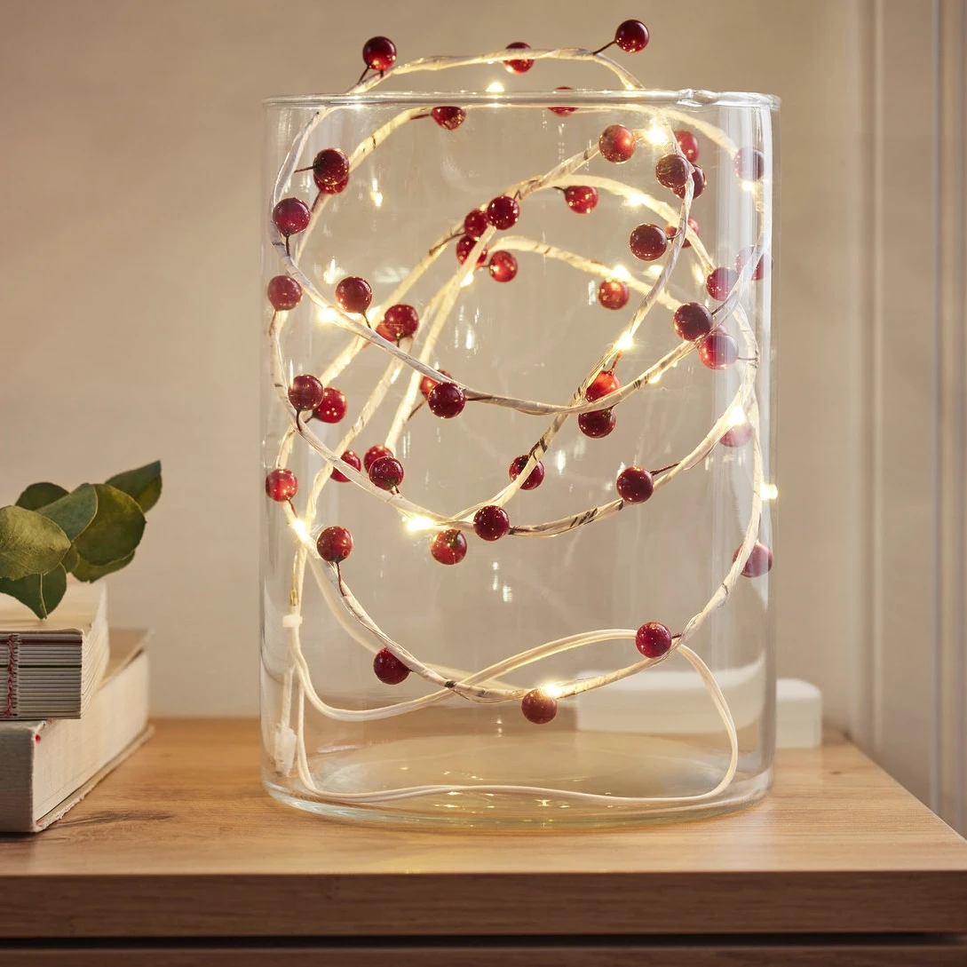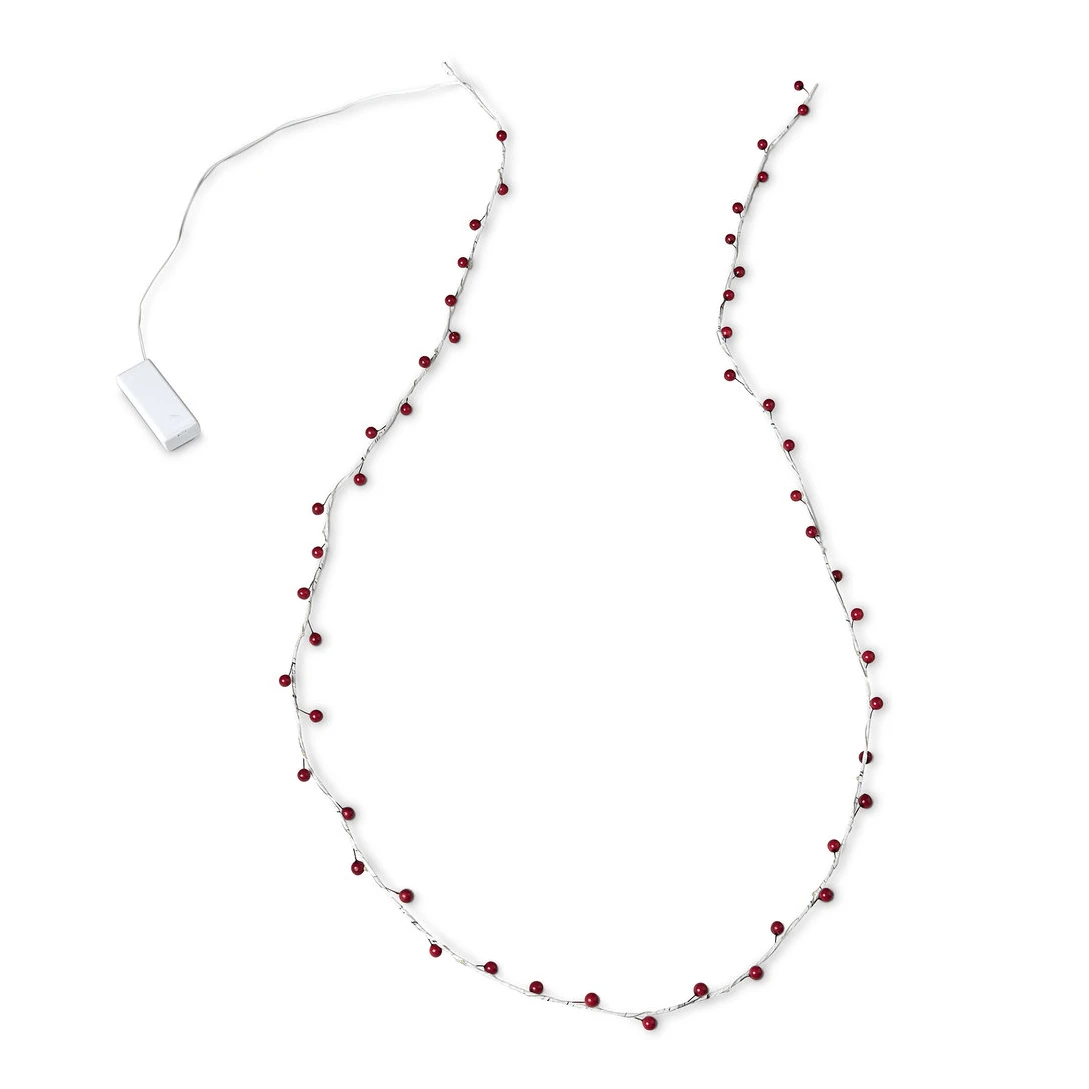 روی این ریسه 50 عدد میوه کوچک قرمز قرار دارد که ظاهر آن را بسیار جذاب و مناسب فضای کریسمسی کرده است. ترکیب رنگ سیم سفید با میوه های قرمز جلوه ای چشم نواز ایجاد کرده و به فضا حس شاد و گرم می بخشد.