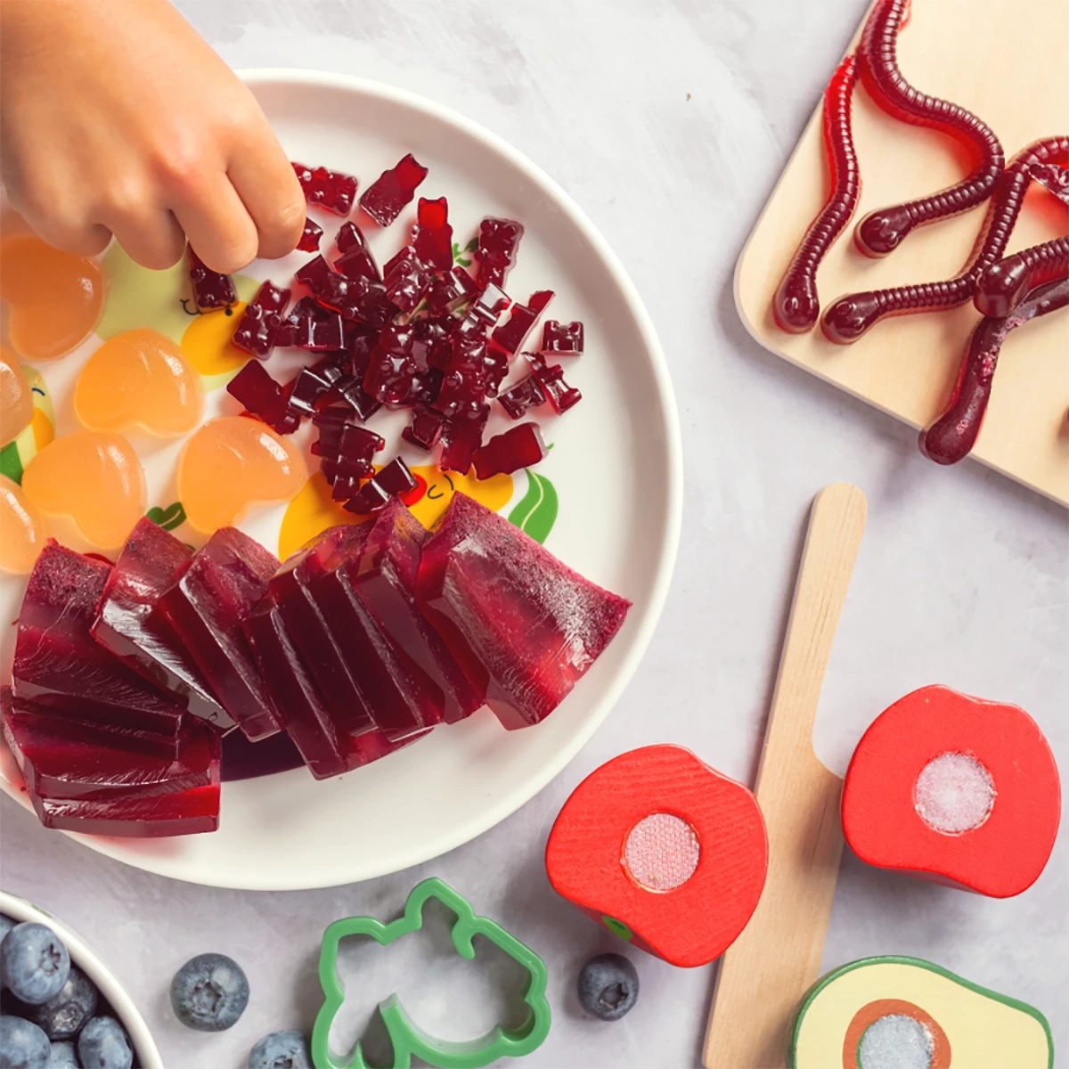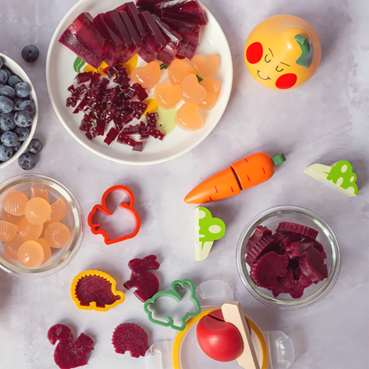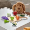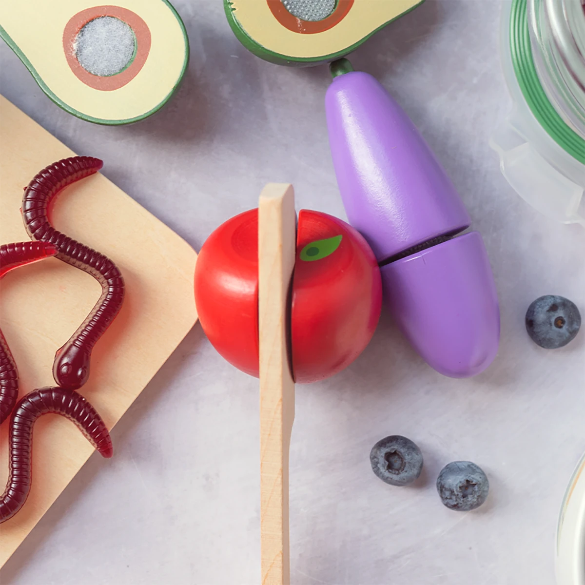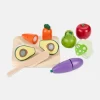 این اسباب بازی شامل انواع مختلف سبزیجات مانند گوجه، آووکادو، هویج، بادمجان، کاهو و … است که دارای دو نیم بوده و با چسب به هم متصل می شوند. آن ها به وسیله یک چاقوی چوبی بر روی سینی چوبی قابل برش هستند. این ویژگی باعث افزایش دقت و هماهنگی دست و چشم کودکان می شود.