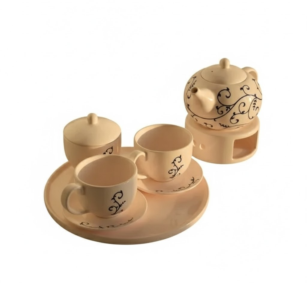 • شامل یک قوری، دو فنجان و نعلبکی، یک قندان