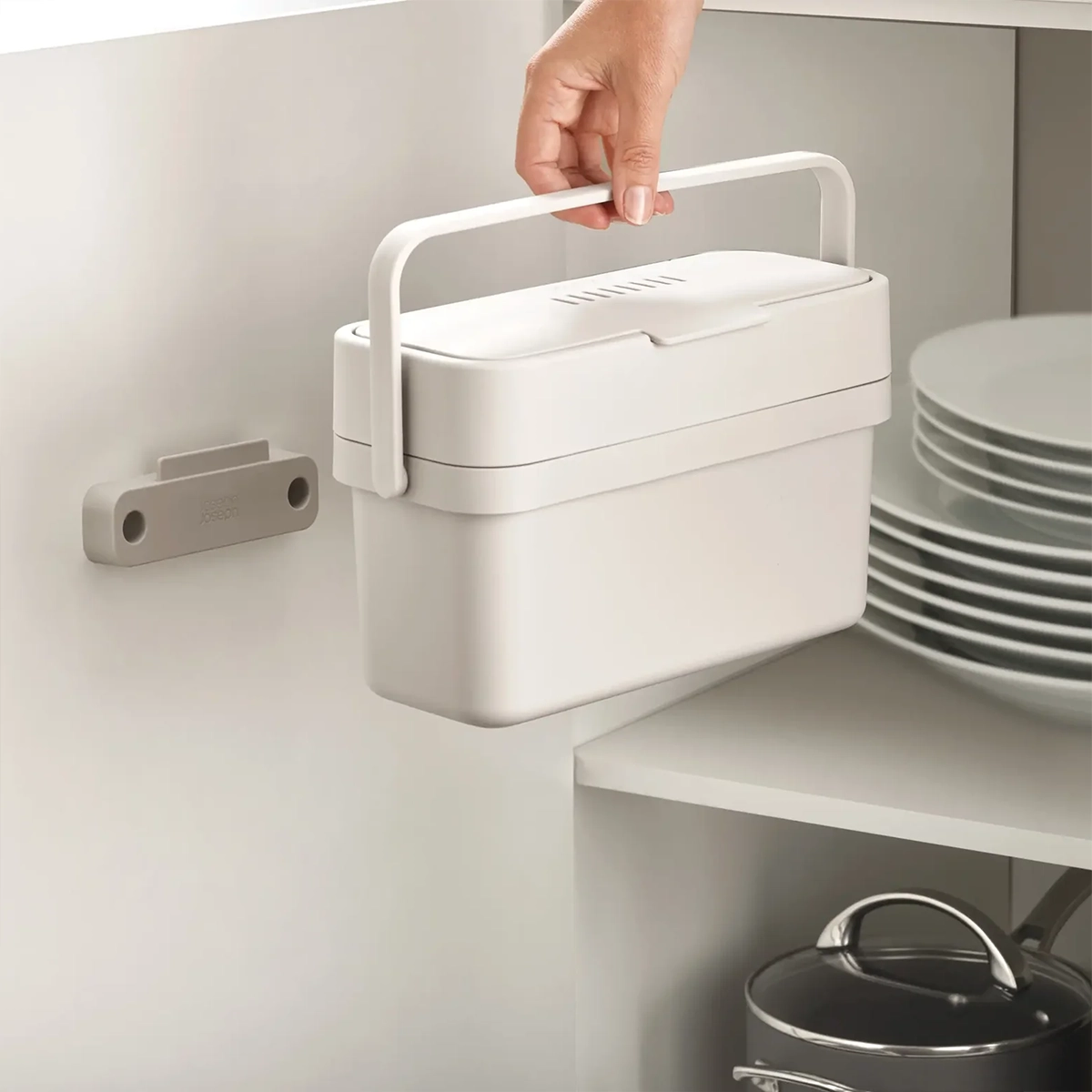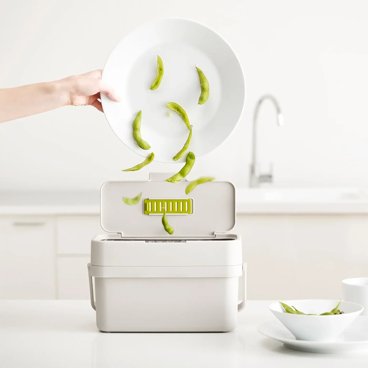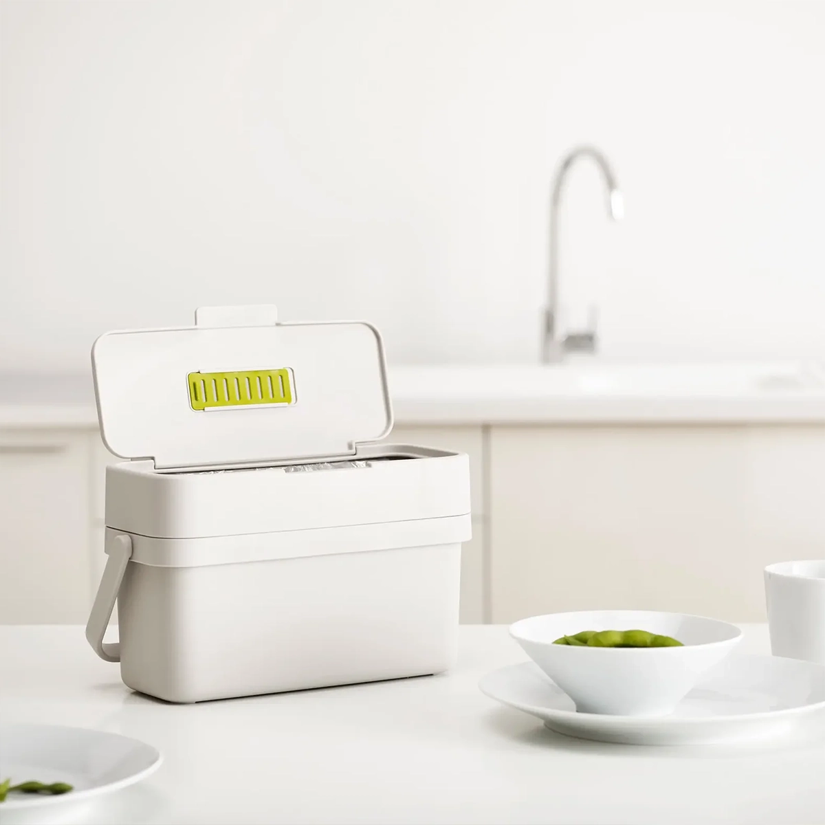سطل کمپوست Joseph Joseph از پلاستیک بادوام و فاقد مواد مضر (BPA Free) ساخته شده و تنها با دست شسته و خشک می شود. اگر به دنبال راهی ساده و زیبا برای کاهش زباله های آشپزخانه و شروع به کمپوست سازی (کمپوست نوعی کود طبیعی است که از بازیافت ضایعات غذایی و گیاهی تهیه میشود و به رشد بهتر گیاهان کمک میکند) در خانه هستید انتخابی کاربردی و سازگار با محیط زیست است.