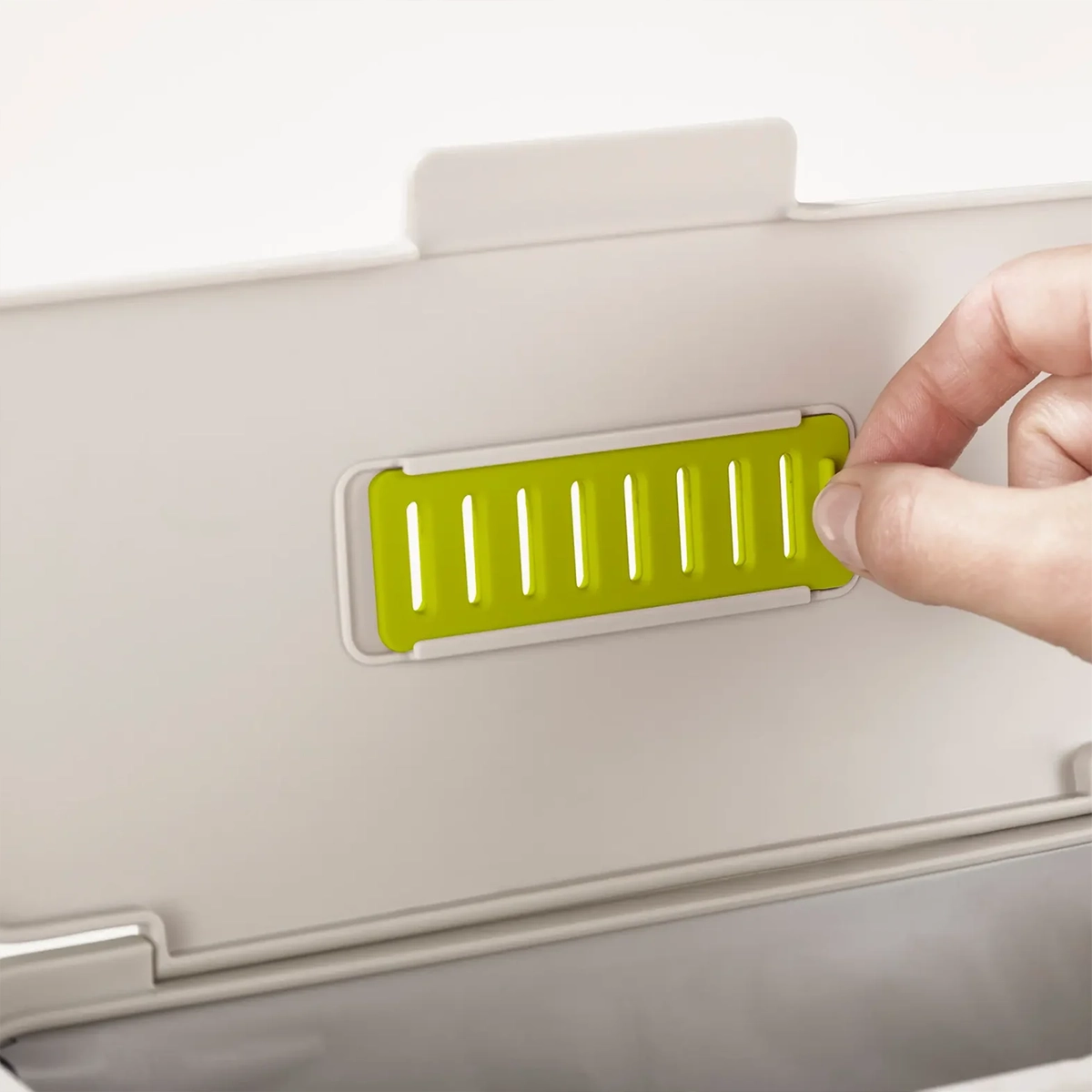 در روزهای گرم سال می توان دریچه سطل زباله جوزف جوزف را بست تا مانعی برای ورود حشرات به داخل سطل ایجاد شود. این محصول همچنین به همراه یک پایه نصب ارائه شده که امکان اتصال سطل به درب داخلی کابینت را فراهم می سازد و فضای آشپزخانه را مرتب و منظم نگه می دارد. طراحی زیبای آن با رنگ خنثی و مدرن سنگی، با انواع دکوراسیون آشپزخانه هماهنگ می شود.