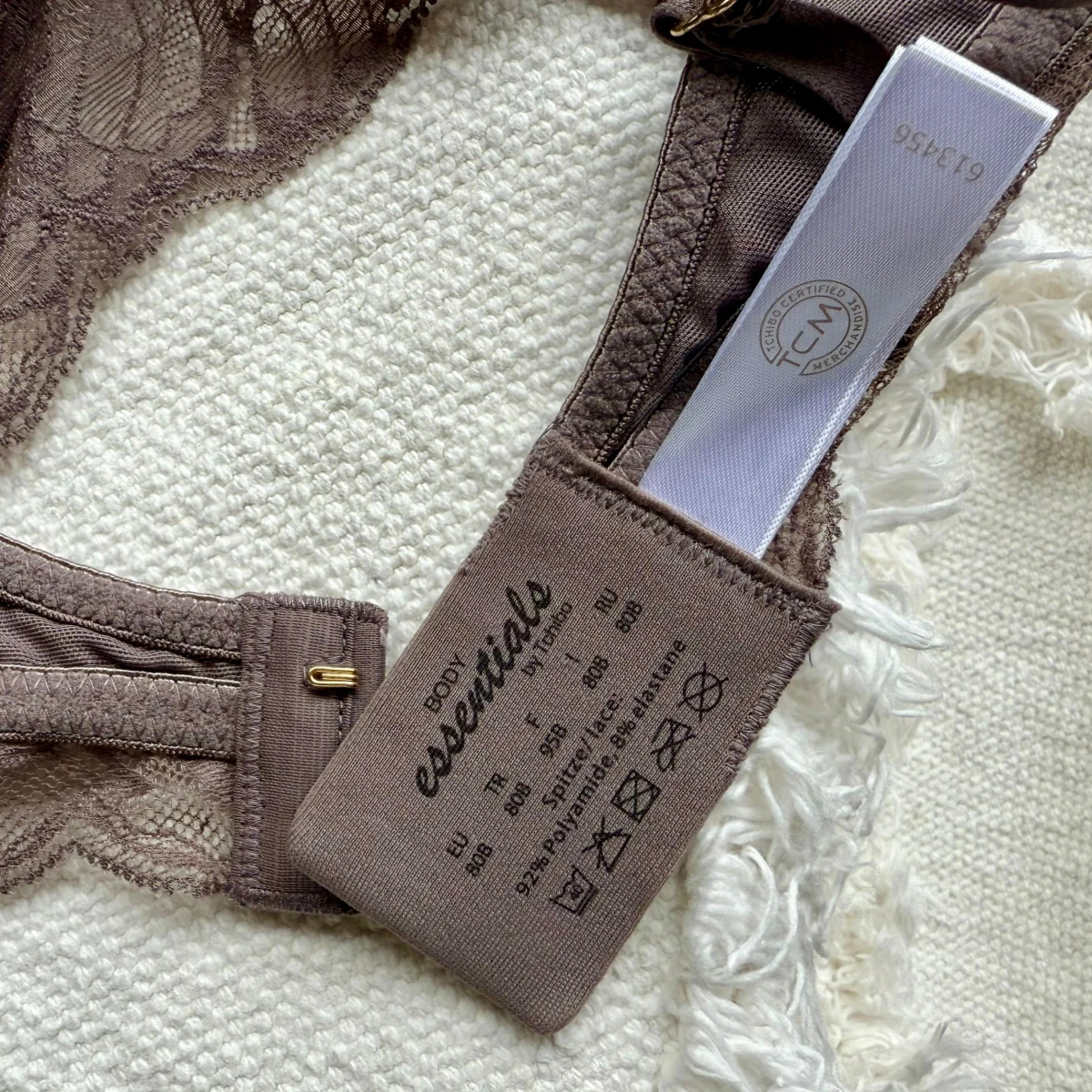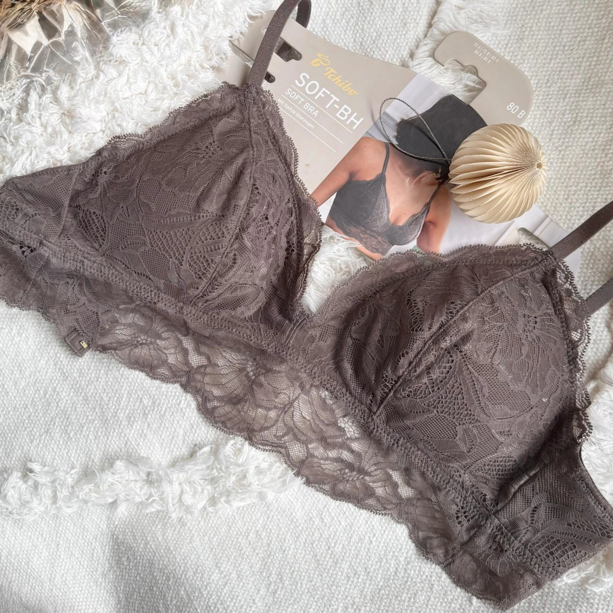 تور زیبا بر روی اسفنج نرم و زیر سینه از آن ظاهر زیبا و چشمگیری ساخته است. اسفنج های آن دارای قابلیت جابجایی بوده و به راحتی جدا می شود. برای شستشوی سوتین توری راحتی زنانه Tchibo می توانید از ماشین لباسشویی با چرخه 40 درجه سانتی گراد استفاده نمایید. فروشگاه چیبوکالا از آن در سایز 80B موجود دارد.