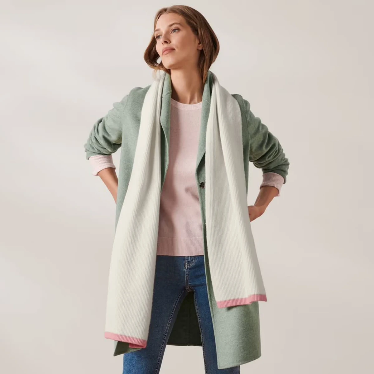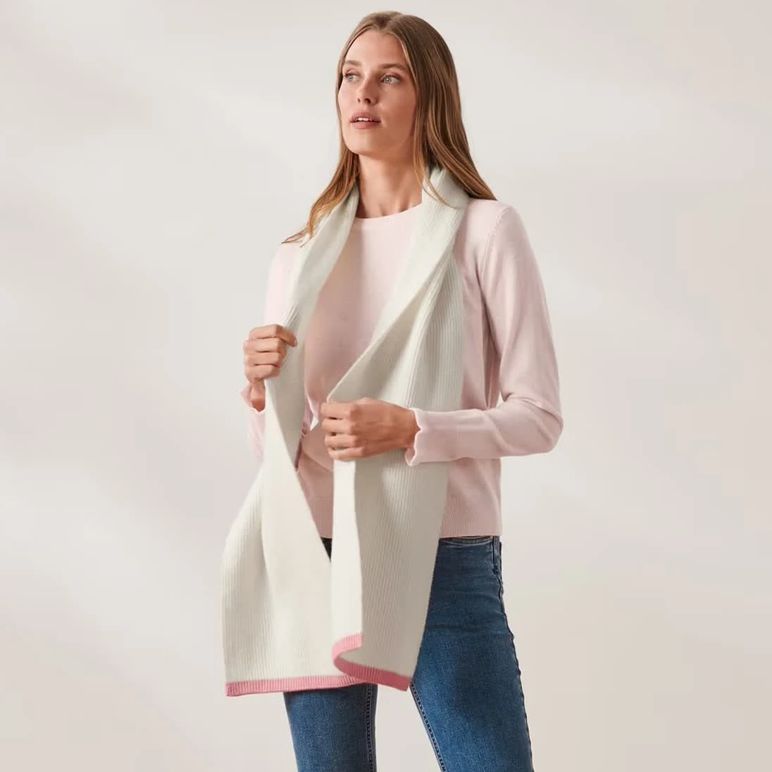 این شال گردن از ترکیب پلی اکریلیک و پلی استر با پشم تولید شده که ضمن حفظ گرما، لطافت خاصی را به ارمغان می آورد. یکی از ویژگی های بارز آن دو طرفه بودن است. رنگ آن سفید خامه ای بوده و در لبه ها به رنگ گلبهی درآمده است.