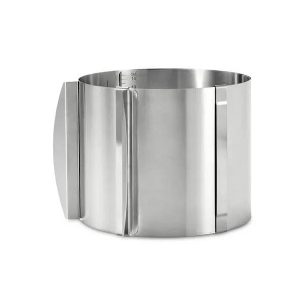 در قسمت داخلی قالب کیک قابل تنظیم Tchibo، مقیاس اندازه گیری سانتی متری تعبیه شده تا بتوانید قطر دلخواه را با دقت تنظیم کنید. این ویژگی به ویژه برای کسانی که به ظرافت و دقت در اندازه ها اهمیت می دهند، بسیار مورد توجه قرار گرفته است. دسته های تنظیم کاربردی در دو طرف قالب قرار گرفته اند تا قطر مورد نظر را به آسانی ثابت کرده و از لغزش حین استفاده جلوگیری کند.