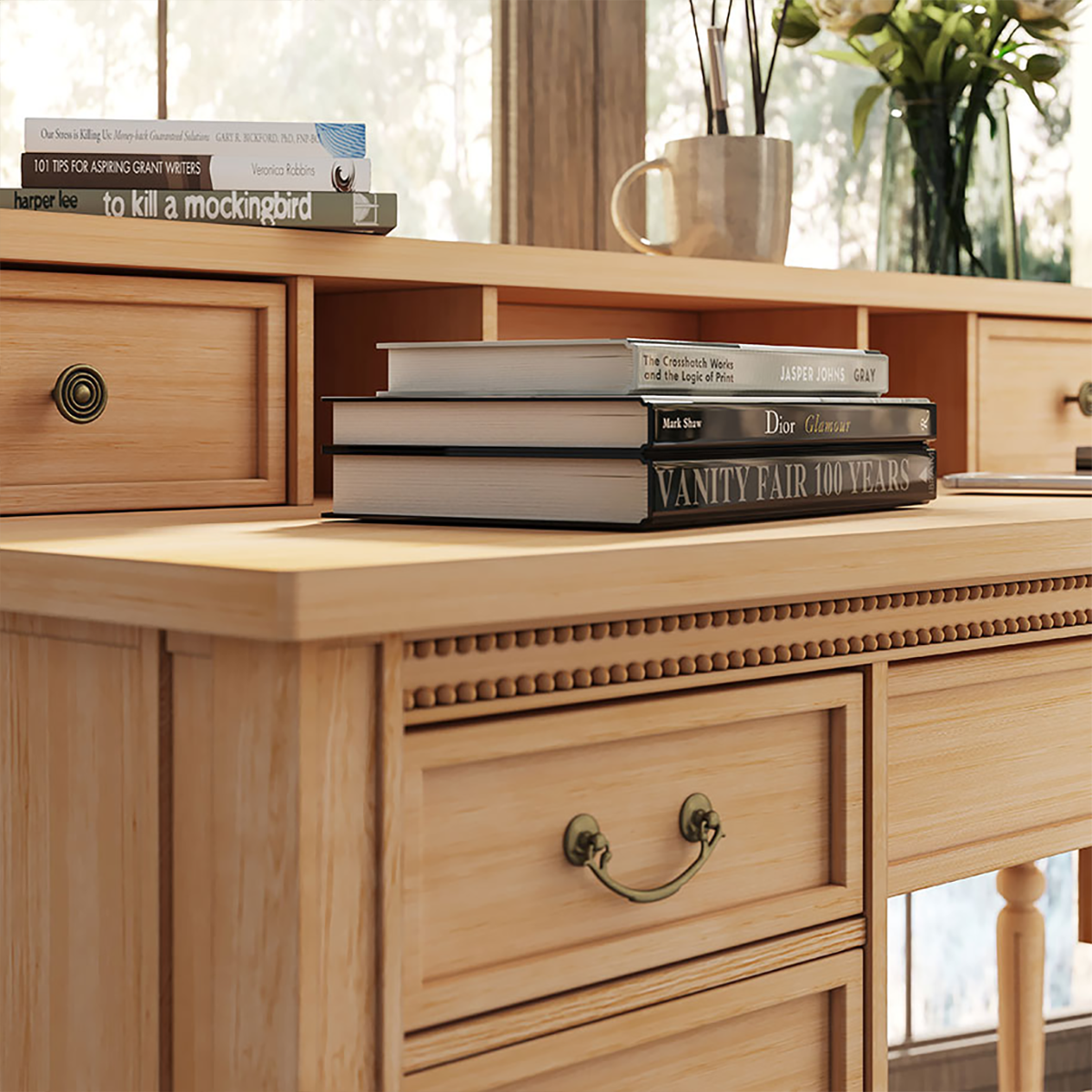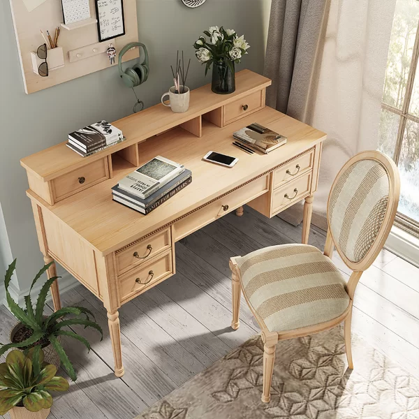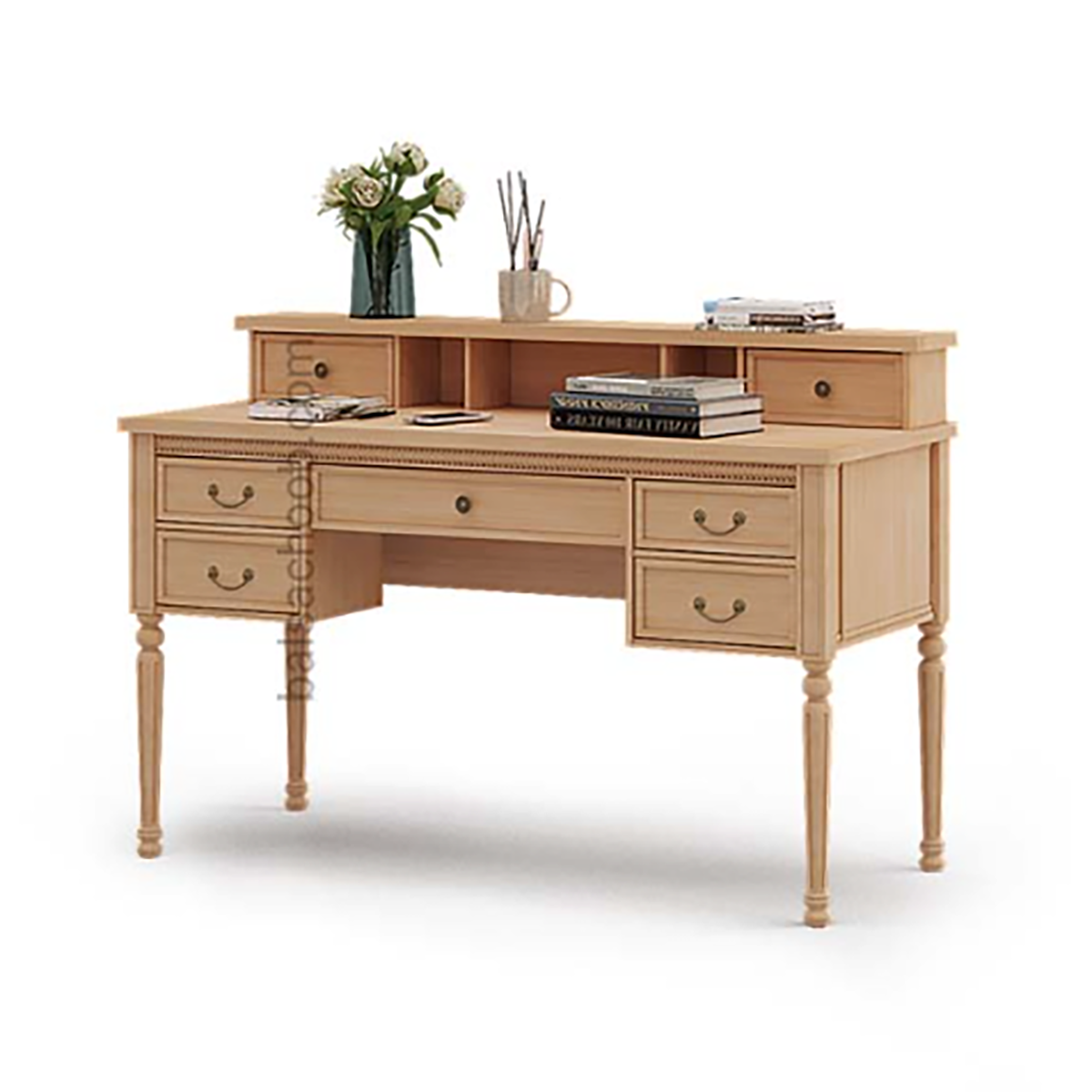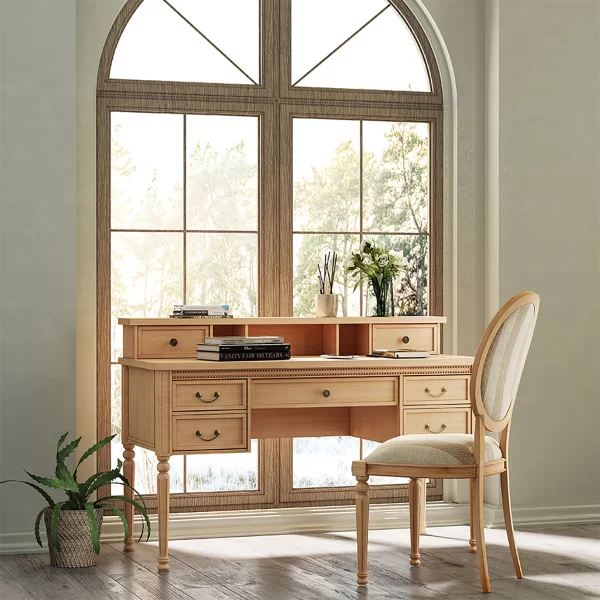 این میز دارای 5 کشوی آرام بند با دستگیره های فلزی است و فضای کافی برای قرار دادن لوازم تحریر و کامپیوتر را دارد. منبت و خرّاطی های زیبای آن که الهام گرفته از چوب بلوط است به زیبایی آن افزوده است. ست آن با صندلی چوب بلوط، فضایی گرم و هماهنگ به اتاق می بخشد.