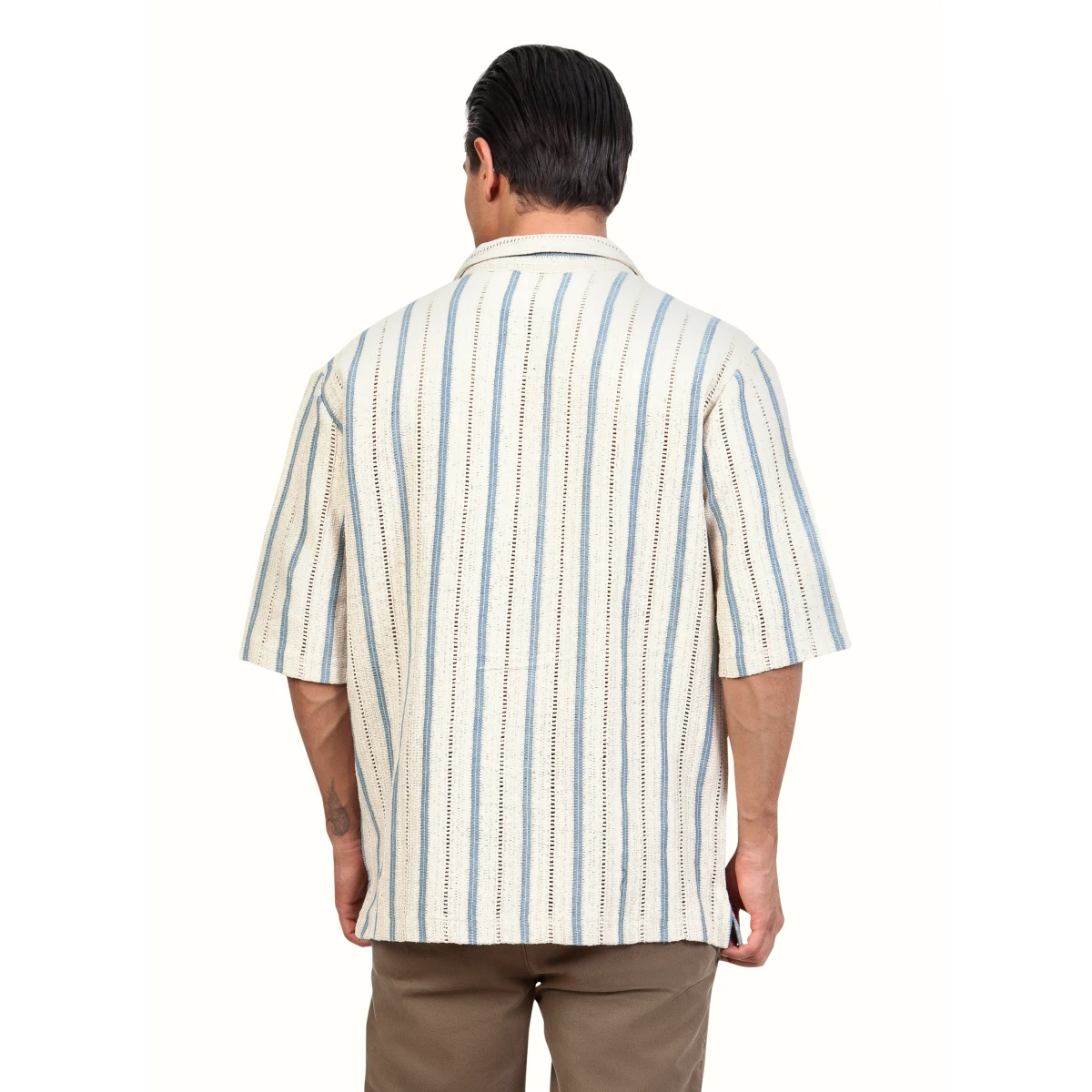 طرح حصیری با راه راه آبی اژه ای جلوه‌ ای ساده و در عین حال شیک به لباس داده و آن را به گزینه‌ ای جذاب برای استایل‌ های تابستانی تبدیل کرده است. یقه انگلیسی به همراه آستین کوتاه، ظاهر کلاسیک و مرتبی ایجاد می‌ کند که به‌ راحتی با شلوار جین یا کتان ست می‌ شود.