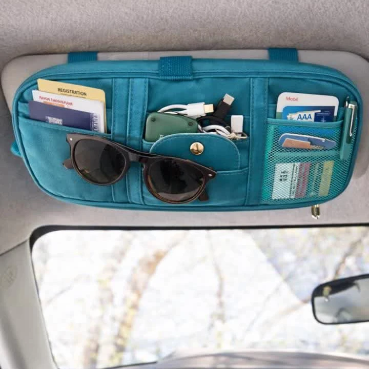 این اورگانایزر دارای چندین جیب و بخش مجزا بوده و برای قرار دادن عینک آفتابی، کارتهای بانکی یا شناسایی، خودکار، بلیت، رسید، مدارک کوچک و سایر لوازم ضروری روزمره بسیار مناسب است. طراحی آن به گونه ای انجام شده که پس از نصب، مانع دید راننده نمی شود و ایمنی رانندگی حفظ می گردد.